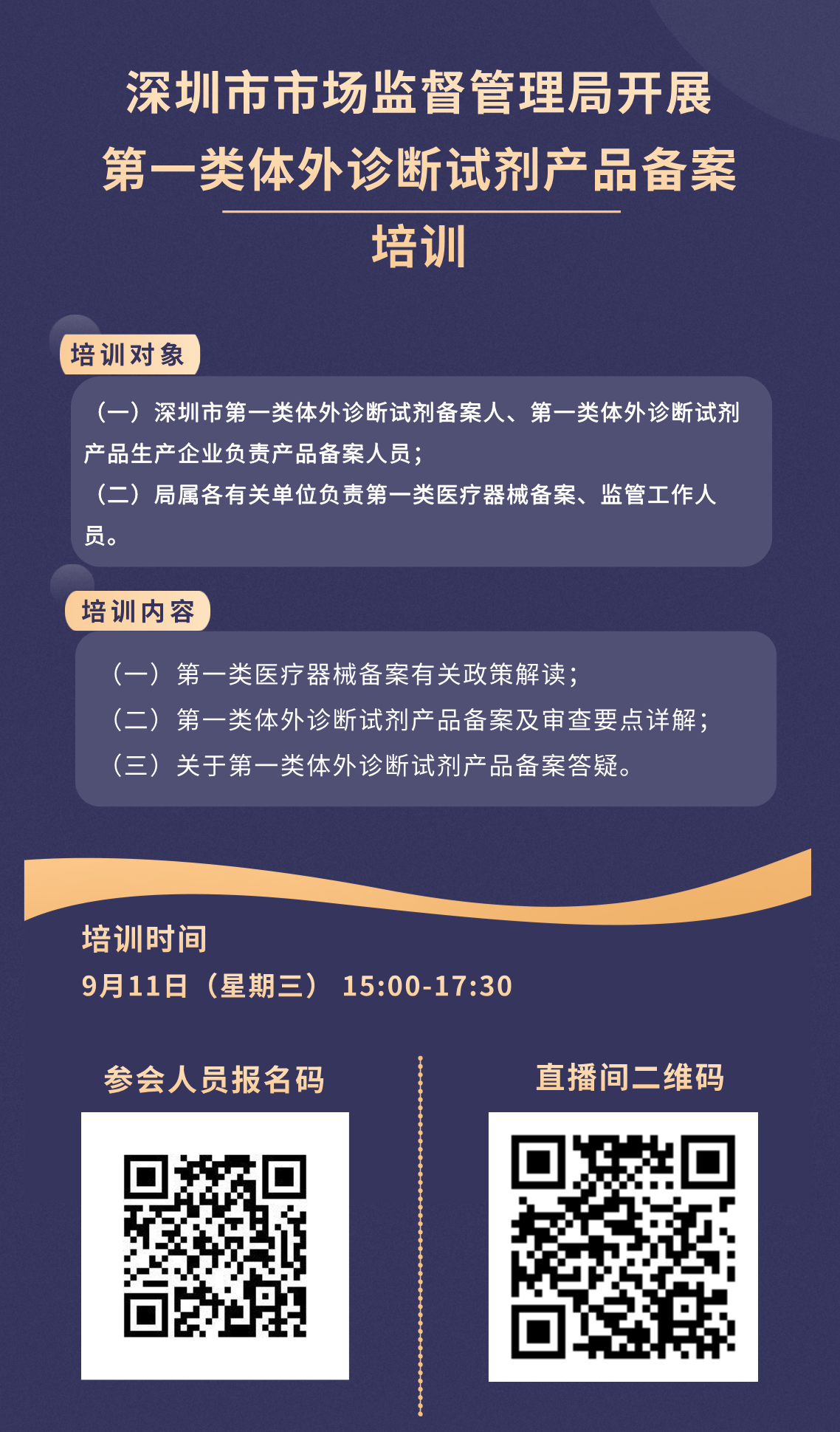 为更好地指导备案人实施《体外诊断试剂分类目录》,做好第一类体外诊断试剂产品备案工作,我局定于2024年9月11日下午开展第一类体外诊断试剂产品备案培训,现将有关事项通知如下:
