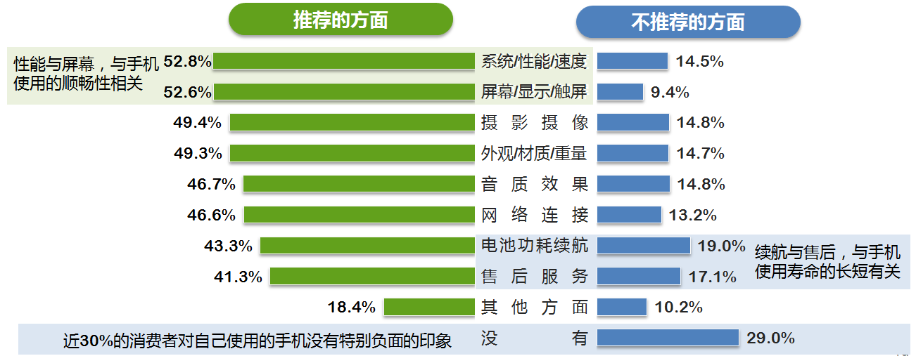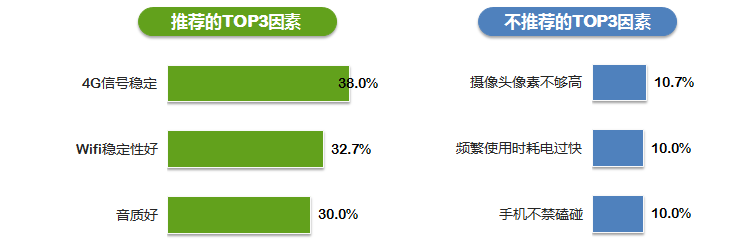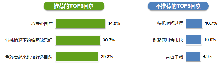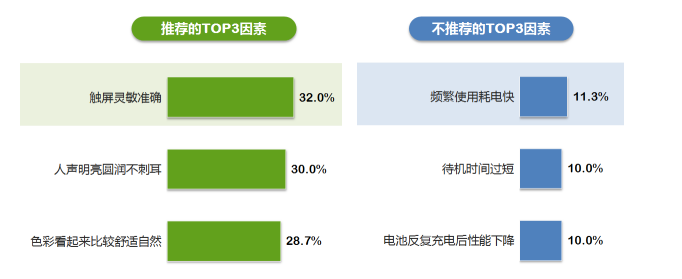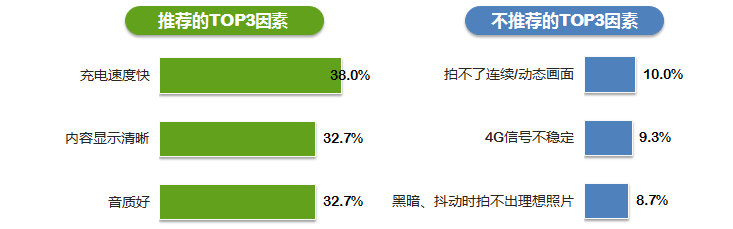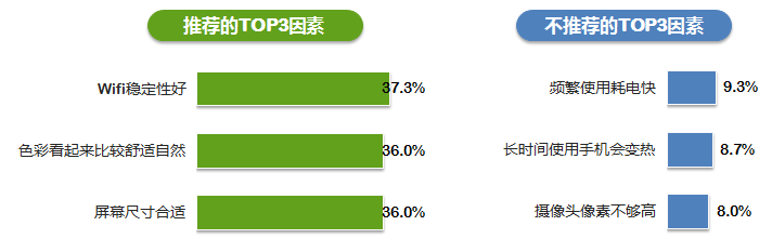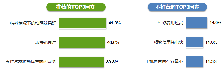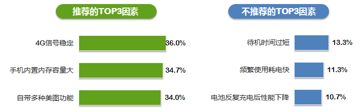 在调查的诸多因素中,手机信号稳定是推荐排第一位的因素,而其余推荐因素则多与手机的画面以及屏显效果好有关,这也反映出消费者对手机屏幕显示方面的看重和满意。在消费者不推荐的因素中,则更多与电池性能以及售后服务有关。
