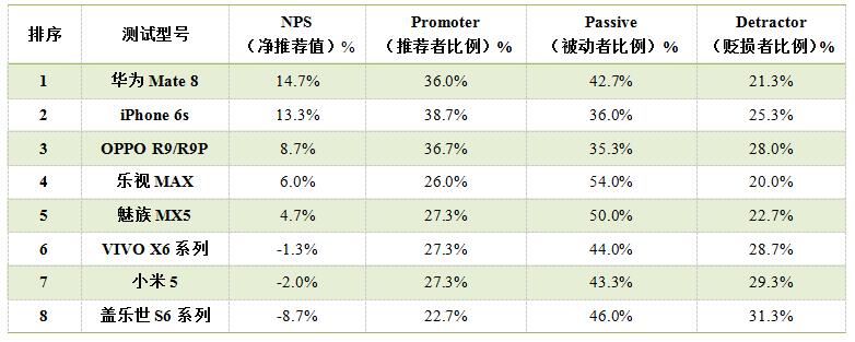 1、华为Mate8 NPS值:14.7%,推荐者比贬损者多14.7%;