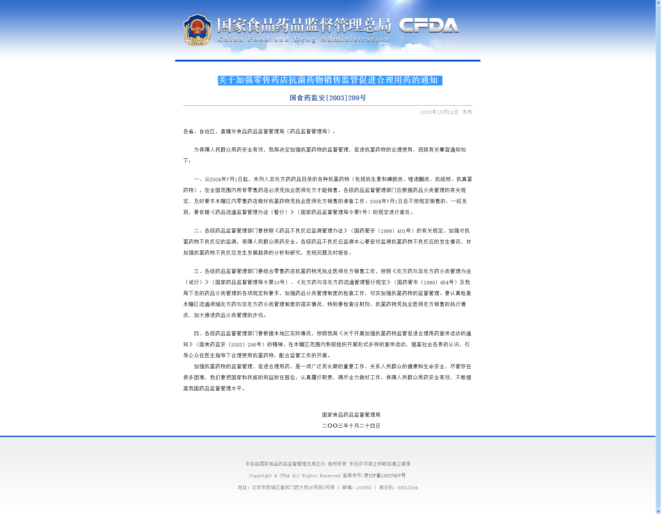 1.《关于加强零售药店抗菌药物销售监管促进合理用药的通知》(国食药监安〔2003〕289号)